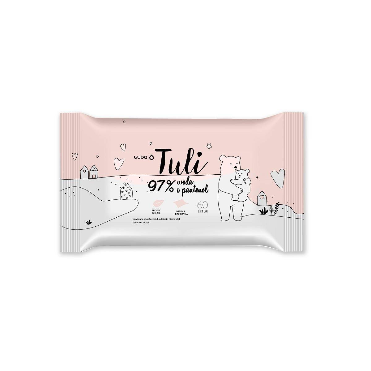 Wyjątkowo delikatne, pielęgnujące chusteczki nawilżane Luba Tuli o prostym składzie na bazie 97% wody i pantenolu.