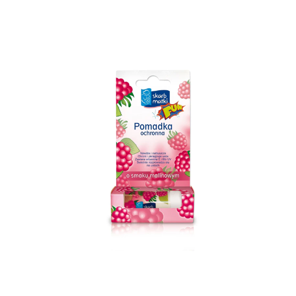 Pomadka Skarb Matki o smaku malinowym to pierwsza pomadka Skarbu Matki. Przeznaczona jest do pielęgnacji delikatnych ust, policzków i noska każdego dziecka. Natłuszcza i nawilża, chroni przed czynnikami atmosferycznymi (wiatr, słońce, mróz) oraz promieniowaniem UVA i UVB. Bardzo łatwo rozprowadza się na ustach. Może być używana do ochrony skóry całej twarzy. Szeroki sztyft umożliwia bezpieczne, samodzielne stosowanie pomadki nawet przez dzieci. Polecana jest od 12. miesiąca życia. Starannie dobrany skład zapewnia właściwą ochronę i likwiduje uczucie spierzchnięcia i suchości skóry. Zawiera witaminę E, która nawilża i neutralizuje wolne rodniki. Sztyft może być również stosowany u osób dorosłych z tendencją do nadmiernego wysychania ust. Ma przyjemny zapach malinowy.