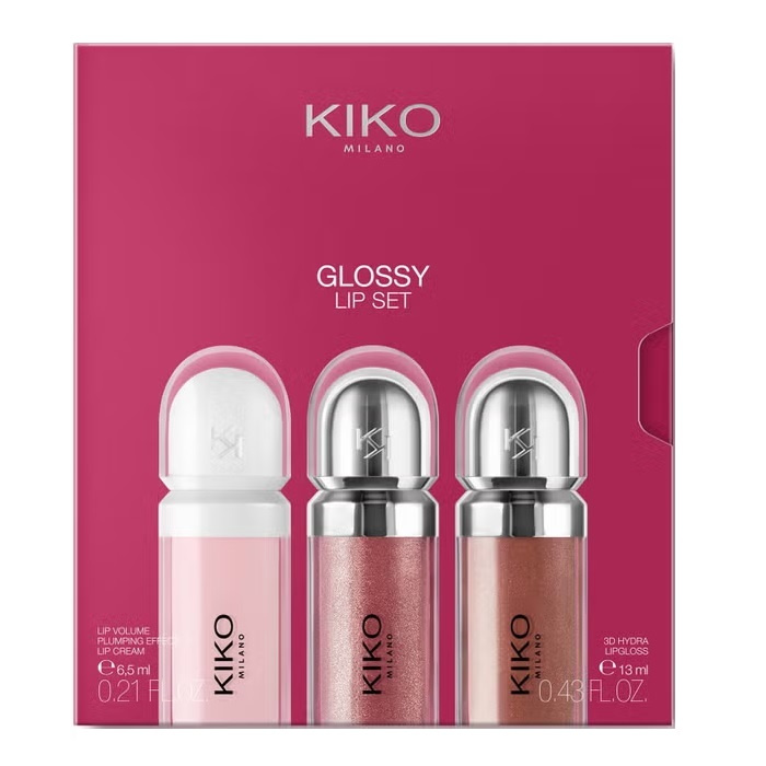 Zestaw do makijażu ust, składający się z 2 nawilżających błyszczyków i 1 pielęgnacyjnego kremu do ust z efektem powiększenia objętości.