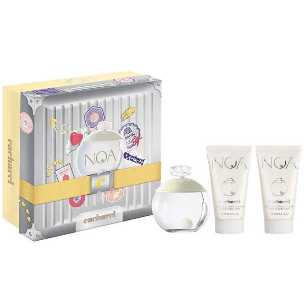 Zestaw zapachowy Cacharel Noa, w skład którego wchodzi woda toaletowa o pojemności 100ml oraz dwa balsamy do ciała o pojemności 50ml.