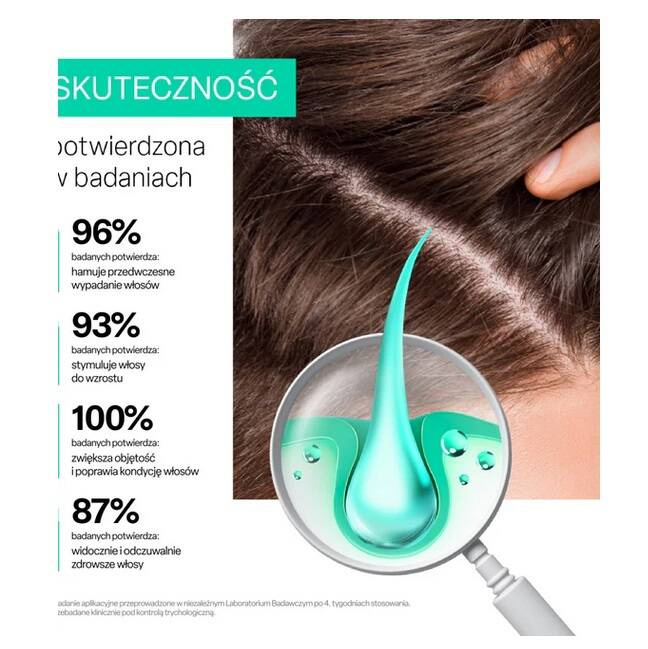 Specjalistyczna kuracja do włosów wypadających i osłabionej skóry zawiera składniki o wielokierunkowym, udowodnionym działaniu. Tetrapeptyd Complex zawiera biomimetyczny peptyd, który zapobiega nadmiernej utracie włosów i stymuluje cebulki do wzrostu. Dzięki niemu, włosy rosną szybciej, a ich wypadanie jest ograniczone. Rewitalizująca biotyna i arginina wraz z kompleksem dotleniającym to połączenie składników aktywnych, stymulujących mikrokrążenie w cebulce włosa. Dbają o prawidłowe odżywienie i dotlenienie cebulki, wpływając pozytywnie na wzrost zdrowych włosów.