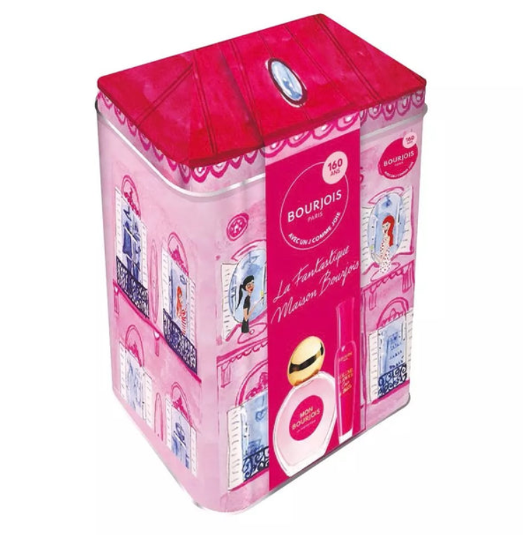 Odkryj urocze pudełko Bourjois! To metalowe, vintage’owe pudełko z kolekcjonerską duszą może stać się eleganckim pojemnikiem do przechowywania. Ozdobione wyjątkową ilustracją „160 lat Bourjois” autorstwa Camille Witt, zawiera wodę perfumowaną Mon Bourjois La Fantastique oraz niezastąpiony tusz do rzęs Volume Glamour.