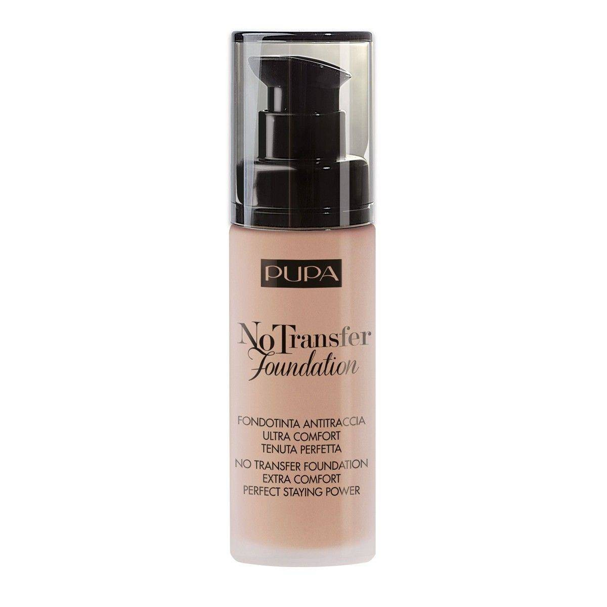 Podkład No Transfer Foundation o wzbogaconej i ulepszonej formule. Posiada właściwości nawilżające, nie ściera się i nie zostawia śladów. Chroni skórę i zapewnia jej elastyczność, gładkość i uczucie komfortu. Minimalizuje niedoskonałości cery oraz matuje ją; idealnie wyrównuje koloryt skóry, nie powodując efektu maski. Zawiera filtr ochronny SPF 15. Delikatna oraz lekka konsystencja zapewnia łatwą aplikację. Utrzymuje się nawet do 14 godzin.