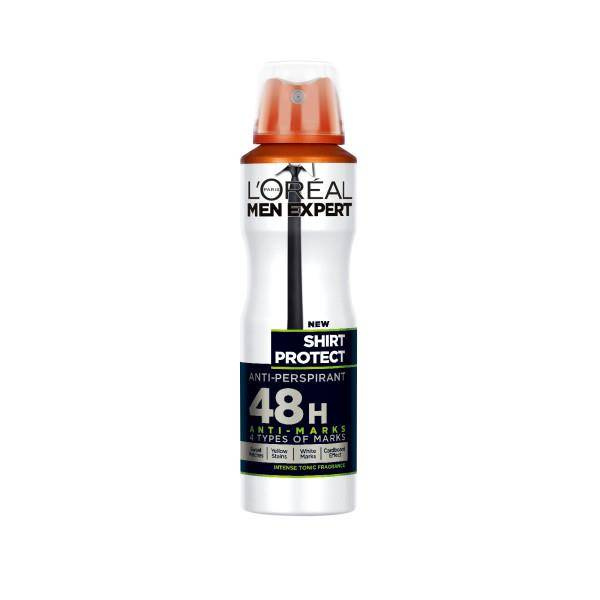Męski antyperspirant w sprayu L'Oréal Men Expert Shirt Protect działa przeciw wilgoci, żółtym plamom, białym śladom, sztywnieniu materiału. Udowodnione działanie non-stop przez 48h*. Większość dezodorantów zawodzi w codziennych sytuacja powodując utratę poczucia komfortu. Dlatego specjaliści z L'Oréal Paris wykorzystali zaawansowaną technologię zawierającą substancje aktywne, które działają wielofunkcyjnie zapewniając skuteczną ochronę i długotrwałą świeżość. Specjalistyczne połączenie rewolucyjnej technologii w dezodorantach Men Expert zapewnia poczucie komfortu w męskim świecie, niezależnie od warunków i sytuacji.