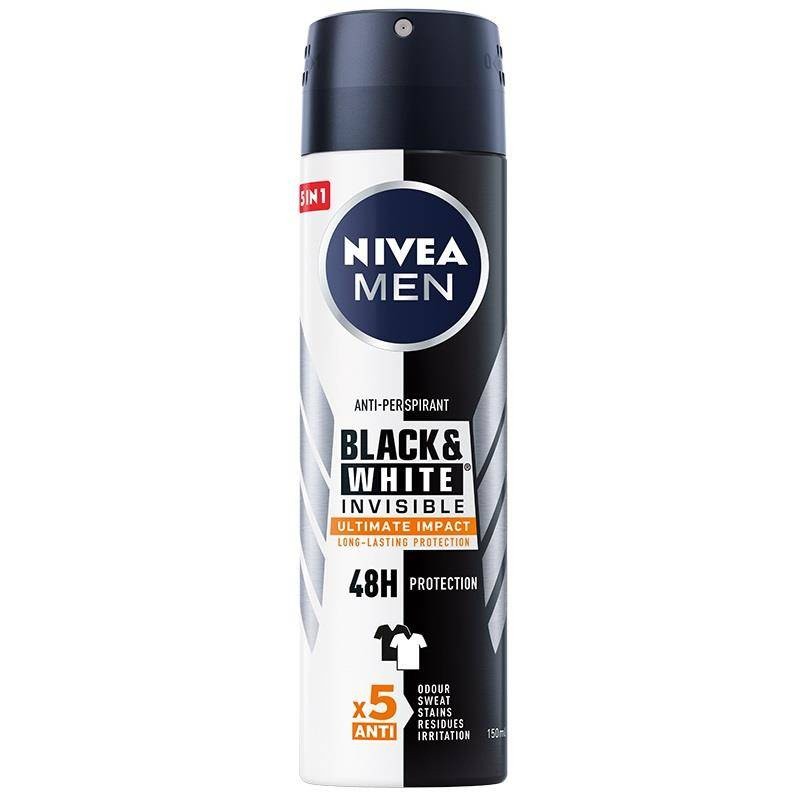 NIVEA MEN Antyperspirant Black & White Invisible Ultimate Protect to produkt opracowany we współpracy z ekspertami z dziedziny tekstyliów, by zapewnić Ci mocną i niezawodną ochronę przed poceniem się, bez ryzyka pobrudzenia ubrań. Antyperspirant ma nowy, świeży zapach, który zapewnia długotrwałe uczucie świeżości i czystości. Nie pozostawia żółtych plam na czarnych ubraniach ani białych śladów na czarnych ubraniach. Nie zawiera alkoholu etylowego, a jego łagodność dla skóry została potwierdzona dermatologicznie. Wygodna forma aplikacji w sprayu. Unikalna formuła chroni Cię przed nadmiernym poceniem się przez 48 godzin i pomaga zachować pierwotny kolor ubrań.
